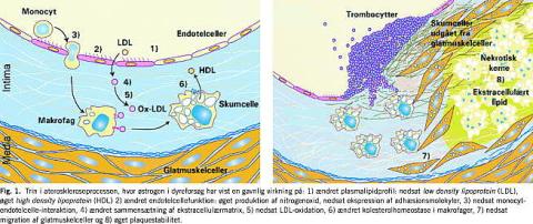 Østrogen har i dyreeksperimentelle undersøgelser en stærkt hæmmende virkning på aterogenesen på såvel aber, kaniner som genmodificerede mus [2]. Derudover ser østrogen ud til at have en gavnlig virkning på endotelcelledysfunktion - en parameter, der anses for at være forløber for alle de øvrige forandringer (Fig. 1 ). Hvorledes østrogen medierer disse virkninger er ikke klart, men det er sandsynligt, at den flygtige gasart nitrogenoxid, som dannes i endotelcellerne, er involveret.