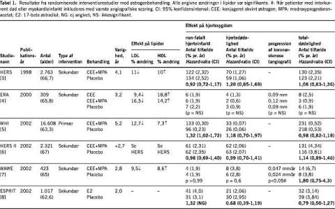 Resultaterne fra en række nye, randomiserede interventionsstudier må imidlertid give anledning til ændring af denne praksis. Siden 1998 er der publiceret fem store studier, der alle viser en enten neutral eller direkte skadelig virkning af HST på udviklingen af IHS. Resultaterne er opsummeret i Tabel 1 . Det største af studierne, der omfatter mere end 16.000 kvinder, måtte stoppes tre år før tid blandt andet grundet en øget forekomst af brystkræft hos de hormonbehandlede kvinder.