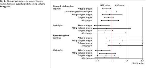 I en nylig publiceret oversigtsartikel i JAMA har man forsøgt at rense data for nogle af disse fejlkilder [9]. Efter en systematisk opsporing af alle observationelle studier inden for HST og en række kliniske slutmålepunkter blev hvert enkelt studiums kvalitet vurderet uafhængigt af to bedømmere og kategoriseret som enten god, acceptabel eller dårlig. Kun studier vurderet som gode eller acceptable blev inkluderet i den efterfølgende metaanalyse. I metaanalysen blev endvidere inkluderet data fra Women's Health Initiative (WHI) og Heart and Estrogen/progestin Replacement Study follow-up (HERS II). Hvad angår primær forebyggelse af hjerte-kar-sygdom, blev der fundet 43 observationelle studier - heraf blev kun 11 case-kontrol-studier, ti kohortestudier samt et lille studium fundet tilstrækkeligt gode til at indgå i en metaanalyse. Resultaterne ses i Fig. 2 . For IHS og hjertedød var RR signifikant nedsat blandt aktuelle brugere, men ikke for aldrig-tidligere-brugere, tidligere brugere eller alle tilsammen. Sammenfaldet mellem det aktuelle brug og lavere forekomst af hjertesygdom forsvandt også, når kun studier med kontrol for socioøkonomisk status blev medtaget i metaanalysen. Kombineret østrogen-gestagen-behandling blev vurderet for sig i fem studier, med RR svingende mellem 0,33 og 1,20. For hjerte-kar-sygdom i det hele taget (dvs. hjertesygdom, apopleksi, pludselig hjertedød og kongestivt hjertesvigt) sås ingen effekt af østrogen i nogle af grupperne. For hjerte-kar-død faldt kun den aktuelle brug sammen med en reduceret risiko.