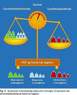 Den observationelle evidens for en gavnlig virkning af CEE på IHS er kvantitativt massiv, men mange af studierne har metodologiske problemer. Resultaterne af en nylig publiceret metaanalyse tyder på, at østrogens effekt på IHS bortfalder, når der på forskellig vis korrigeres for disse problemer. Dette er i overensstemmelse med fire sekundære og et primært interventionsstudium, hvor CEE (og i et enkelt studium E2) har en i bedste fald neutral, i værste fald skadelig virkning på hjerte-kar-sygdom (Fig. 3 ). Tilbage står imidlertid dels en uforklaret markant forskel i udviklingen af IHS hos henholdsvis kvinder og mænd, dels en række dyreeksperimentelle undersøgelser, der konsistent tyder på en gavnlig virkning af først og fremmest E2, men også CEE, på udviklingen af aterosklerose. De dyreeksperimentelle undersøgelser tyder på, at østrogen udøver en gavnlig virkning på arterievæg med intakt endotel, men en neutral eller decideret skadelig virkning på arterievæg med skadet endotel, således som det må forekomme hos ældre eller hjertesyge kvinder. Man kunne således forestille sig et »terapeutisk vindue« for HST af kvinder, dvs. optimalt en behandlingsstart i umiddelbar forlængelse af den endogene østrogenproduktions ophør. Det bliver dog formentlig ikke muligt at skabe videnskabelig evidens for et sådant regimen. En netop offentliggjort analyse af det øgede antal tilfælde af brystkræft i HST-gruppen i WHI viste, at disse tilfælde blev diagnosticeret i et senere stadium, og derfor havde en dårligere prognose [10]. Dette fund understøttes af en stor engelsk kohorteundersøgelse af en million kvinder, der konkluderer, at brugen af HST resulterer i ét kræfttilfælde pr. 50 kvinder, der behandles med HST i ti år. Drejer det sig om kombinationsbehandling med østrogen og gestagen, er det udelukkende brystkræft; behandles kun med østrogen, er det hovedsageligt endometriekræft [11].