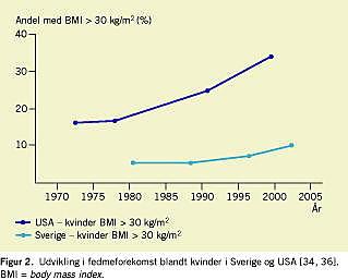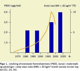 PCB er nu forbudt i vestlige lande, hvilket har betydet, at der er sket et fald i forekomsten i blandt andet modermælk [31]. Der er imidlertid en stigende bekymring for nye miljøkemi-kalier, som f.eks. de bromerede flammehæmmere [31-33], hvoraf koncentrationen i de seneste årtier har været stigende. Bromerede flammehæmmere anvendes som brandhæmmere i blandt andet byggematerialer, plastik, elektriske apparater (f.eks. computere og fjernsynsapparater) og tekstiler. De bromerede flammehæmmere kan afgives fra produkterne og indtages af mennesket gennem f.eks. støv og modermælk. I Danmark er det ikke muligt at følge udviklingen i kemikalieforekomst i modermælk og menneskets direkte eksponering her-for, da der ikke bliver foretaget systematiske overvågninger af organiske miljøkemikalier i modermælken. I Sverige har man derimod de seneste 30 år gennemført en systematisk overvågning af kemikaliekoncentrationerne i brystmælk. Værdierne af PBDE i Sverige var indtil 1997 stærkt stigende, men som følge af regulering er værdierne derefter faldet (Figur 1 ). I flere ad hoc-undersøgelser er det påvist, at værdierne i USA er langt højere end værdierne i Sverige. I studier har man fundet koncentrationer op til over 100 gange højere i USA end i Sverige [35]. Om end korrelationsstudier ikke kan tillægges særlig betydning, hvad angår årsagssammenhænge, kan de være hypotesedannende, og det er interessant, at andelen af fede (body mass index (BMI) > 30 kg/m2 ) i USA er langt højere end andelen i Sverige (Figur 2 ). Det er dog vanskeligt at vurdere risikoen ved de bromerede flammehæmmere, da koncentrationerne er anderledes, og brom er svagere end klor [32].
