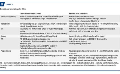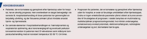 Hvert år får ca. 4.000 personer pludseligt, uventet hjertestop uden for hospital (out-of-hospital cardiac arrest (OHCA)) i Danmark. Tredivedagesoverlevelsen er steget fra 4% i 2001 til 13% i 2014 [1], men det er stadig en af de alvorligste medicinske tilstande. Der er konsensus om, at tidlig erkendelse og hurtig alarmering, tidlig hjerte-lunge-redning (HLR), tidlig defibrillering og avanceret hospitalsbehandling er afgørende faktorer for overlevelse efter OHCA [2]. Nogle patienter vågner hurtigt op, efter at cirkulationen er genetableret (return of spontaneous circulation (ROSC)), men over halvdelen vil forsat være komatøse ved ankomsten til hospitalet. Prognosen hos denne gruppe patienter er alvorlig med en dødelighed på omkring 50% [3]. Denne artikel har til formål at udbrede ny viden om den avancerede hospitalsbehandling af patienter, der forbliver komatøse efter ROSC, med sigte på at forbedre og ensarte behandlingen på landets akuthospitaler.