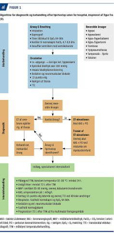 tificere intrakraniale, intratorakale og respiratoriske årsager til hjertestoppet (Figur 1). Røntgenbilleder af thorax kan tages for at identificere lungeødem og læsioner efter HLR samt for at konstatere korrekt placering af trakealtube og centralvenekateter. Blodtrykket er ofte labilt i dagene efter OHCA, og der er derfor brug for vasopressorbehandling og/eller inotropika, hvor henholdsvis noradrenalin eller dopamin og dobutamin anbefales sammen med væskeinfusion. Venoarteriel ekstrakorporal membranoxygenering kan overvejes hos udvalgte patienter med refraktære hjertestop [12]. Cirkulationen monitoreres med kontinuerlig, invasiv blodtryksmåling samt iltmætning i centralt veneblod og støttes af kliniske parametre som hjertefrekvens og urinproduktion. Hos nogle vil anlæggelse af et pulmonalarteriekateter (Swan-Ganz) være indiceret til monitorering af systemisk vaskulær modstand og cardiac output. Transtorakal ekkokardiografi er altid indiceret og skal udføres akut hos ustabile patienter (Figur 1) [9]. Øget centralisering af modtagelsen af patienter med hjertestop anbefales af Europæisk Råd for Genoplivning (ERC) [9]. Registerstudier har vist en sammenhæng mellem indlæggelse på et hjertecenter og bedre overlevelse [13, 14], uden at årsagssammenhængen er bevist, men patienterne på hjertecenteret blev hyppigere set af en kardiolog og fik foretaget transtorakal ekg og KAG [14]. Da mange af de avancerede behandlingsmodaliteter kun udføres på hjertecentre, er det oplagt, at patienter, der forbliver komatøse efter ROSC, modtages der.