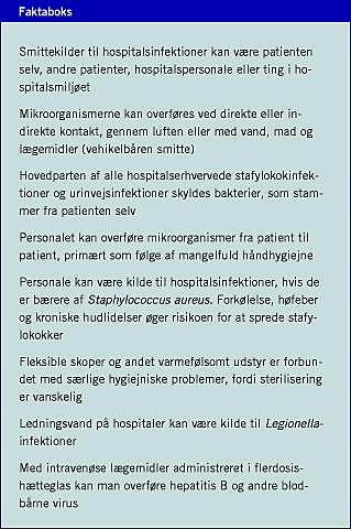 Hospitalsinfektioner omfatter alle infektioner, som opstår, mens patienterne er i hospitalsmiljøet, og som ikke var i inkubationsstadiet ved indlæggelsen. Spektret spænder vidt fra banale forkølelser til livstruende sepsis med methicillinresistente Staphylococcus aureus (MRSA) og andre multiresistente mikroorganismer. Smittekilderne kan være patienten selv, andre patienter, hospitalspersonale eller ting i hospitalsmiljøet (Tabel 1 ). Mikroorganismerne kan overføres ved direkte eller indirekte kontakt, gennem luften eller med vand, mad og lægemidler (vehikelbåren smitte). Nedenfor gennemgås de vigtigste smittekilder og smitteveje.