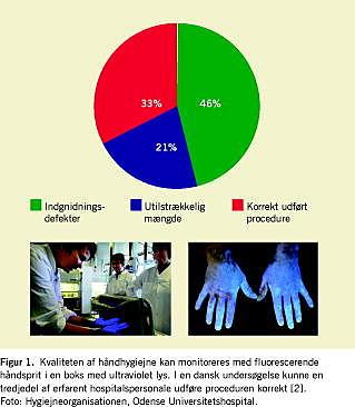 Mangelfuld håndhygiejne hos personalet regnes for den vigtigste årsag til indirekte kontaktsmitte mellem patienter [6]. I adskillige undersøgelser er det påvist, at håndhygiejne kun udføres i omkring halvdelen af de tilfælde, hvor det er indiceret, og kvaliteten af håndhygiejnen er ofte mangelfuld. I en nyligt publiceret dansk undersøgelse var det således kun en tredjedel af personalet, som kunne udføre korrekt håndhygiejne [7] (Figur 1 ). Håndhygiejnens betydning er bl.a. illustreret i en schweizisk undersøgelse, hvor intensiveret håndhygiejne med fokus på anvendelse af håndsprit over en årrække reducerede antallet af hospitalsinfektioner med over 40% og mere end halverede forekomsten af MRSA [8]. Det er desværre ikke alle kontaktoverførte infektioner, som kan forebygges effektivt med håndsprit alene. Norovirus, som hvert år er årsag til store epidemier på danske hospitaler, er således ikke særlig følsomt for de koncentrationer af alkohol, som sædvanligvis anvendes i hånddesinfektionsmidler [9]. Hygiejnisk hånddesinfektion efter kontakt med noroviruspatienter skal derfor altid forudgås af klassisk håndvask med sæbe og vand.