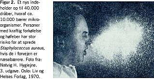 Ca. 25% af hospitalspersonalet er permanente bærere af S. aureus i næsen, hvorfra bakterierne sekundært spredes til huden. Særlig opmærksomhed knytter sig til MRSA-bærere, som i enkelte tilfælde har smittet patienter, men almindelige følsomme stafylokokker er potentielt lige så smittefarlige. Risikoen for at overføre S. aureus fra en symptomfri næsebærer er almindeligvis ringe, hvis man overholder god håndhygiejne, men risikoen kan øges drastisk, hvis man nyser (Figur 2 ) som led en kraftig forkølelse eller høfeber (cloud -fænomenet) [23, 26, 27]. Bakterier fra nys bæres hovedsageligt på store dråber, som falder ned inden for 1-2 meters afstand. Man smitter derfor ikke luftbårent over længere afstand, men stafylokokker i nedfaldne dråber vil kontaminere berøringsflader, hvor de kan overleve i flere uger og overføres til patienter ved indirekte kontakt [16].