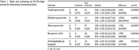 Som nævnt blev 12.658 personer inkluderet. De havde en gennemsnitsalder på 67,5 år. De er nu blevet fulgt i gennemsnit i 5,1 år. Der var ingen aldersforskel på inklusionstidspunktet eller forskel på observationslængden mellem screenings- og kontrolgruppen. Af de 6.339 mænd, der blev inviteret til screening, mødte 4.843 (76%) op. Af de fremmødte havde 191 (4%) et AAA. De 24 (0,5%) af de screenede havde initialt et AAA på over 5 cm i diameter og blev derfor henvist til præoperativ vurdering. Ved årlig kontrol af de øvrige, der havde AAA, blev yderligere 51 henvist til præoperativ vurdering. I alt blev 60 personer i screeningsgruppen opereret, inklusive de ikkefremmødte til screening, mod 41 personer i kontrolgruppen (p > 0,05), men kun syv operationer i screeningsgruppen blev udført akut mod 27 i kontrolgruppen (p < 0,001) (Tabel 1 ). Hyppigheden af akutte operationer i screeningsgruppen var således signifikant 74% lavere end i kontrolgruppen (95% CI: 54- 89%).