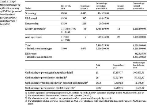 Screening for AAA reducerede hyppigheden af akutte operationer med 74%, og AAA-specifik hospitalsmortalitet med 68%. Omkostningerne per forhindret hospitalsdødsfald pga. AAA var 67.855 kr. og sandsynligvis omkring 7.540 kr. per reddet restleveår. Disse udgifter synes at være beskedne sammenlignet med andre, selv ved udelukkelse af dødsfald pga. rumperet AAA uden for hospital. Halvdelen til to tredjedele med rumperet AAA når imidlertid ikke operation (2, 4, 17). Hvis man formoder, at halvdelen ikke når operation, ville den AAA-specifikke mortalitet reduceres 73% ved screening, og omkostningerne ville være omkring 3.770 kr. per reddet restleveår, -5.587 kr. såfremt de indirekte omkostninger til screening inkluderes. Sensitivitetsanalyser viste, at selv ved de mest ekstreme variationer, hvor elektive operationer er dyrere end akutte pga. rumperet AAA, ville omkostningerne fortsat være acceptable.