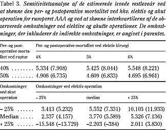 Tabel 3 viser også en sensitivitetsanalyse, når omkostningerne ved operationerne varieres inden for de observerede kvartiler. Omkostningerne ville da variere fra 10.103 kr. til -15.548 kr. - altså sparede omkostninger. Hvis resultaterne fra Tabel 2 og Tabel 3 kædes sammen, ville de største omkostninger blive ved 6%'s og 40%'s mortalitet ved hhv. planlagt operation og akut operation pga. rumperet AAA kombineret med 25% højere omkostninger ved elektiv kirurgi og 25% lavere udgifter ved akut kirurgi. Omkostningerne ville da blive 14.860 kr. per reddet restleveår.