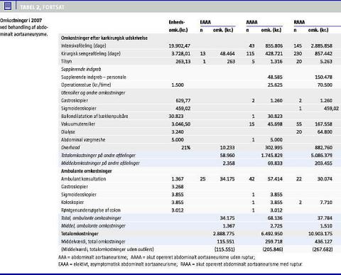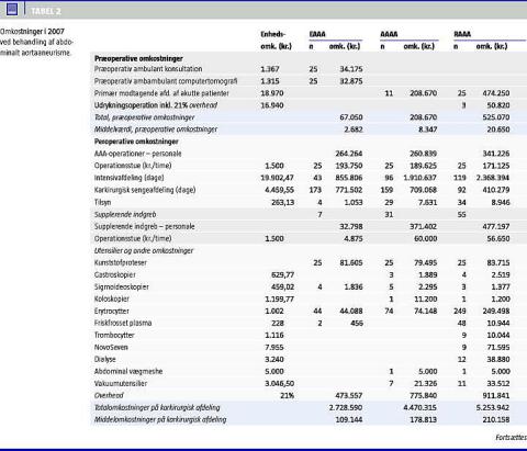 Resultater: Omkostningerne ved akutte operationsforløb varierede betydeligt (33.069-2.842.708 kr. pr. forløb). De samlede omkostninger for EAAA, AAAA og RAAA blev beregnet til henholdsvis 115.551 (95% konfidensinterval (KI): 96.841; 134.260) kr., 259.712 (95% KI: 128.950; 390.484) kr. og 436.127 (95% KI: 172.415; 669.839) kr. og var signifikant forskellige (p = 0,002). Ved eksklusion af tre patienter med ekstreme omkostninger beregnes gennemsnitsomkostningerne til 115.551, 205.846 og 267.682 kr., (p = 0,006). DRG-tariffen for EAAA og RAAA var henholdsvis 100.339 kr. og 98.087 kr. Resurseforbruget ud over den karkirurgiske indlæggelse omfattede henholdsvis 6%, 31% og 52% (6%, 15% og 27% ved eksklusion af tre patienter) af de samlede omkostninger for henholdsvis EAAA, AAAA og RAAA (p < 0,001).