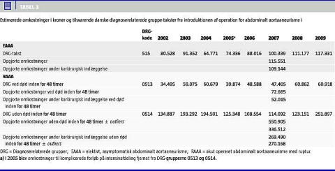 Sammenlignes de opgjorte omkostninger med gældende DRG-takster for 2007, er der overvejende god overensstemmelse vedrørende planlagte operationer og operation for ruptur med død inden for 48 timer (Tabel 3). Vedrørende akut opererede er de faktisk opgjorte forløbsomkostninger to til fire gange større end DRG-taksten. Dette skyldes, at DRG-taksten ikke inkluderer omkostninger uden for den karkirurgiske indlæggelse. Når de opgjorte omkostninger ved indlæggelsesforløb sammenlignes med DRG-taksten, er de dog mere end dobbelt så høje som DRG-taksten. En klinisk uforklarlig og drastisk reduktion af udgifterne til overlevende med ruptur skete i 2005 og de efterfølgende år. De foregående års DRG-relaterede valideringsarbejde blev derfor gennemgået. Heraf fremgår det, at på baggrund af opfordring af Dansk Selskab for Anæstesiologi og Intensiv Medicin [15] blev der i løbet af 2004 oprettet fire selvstændige DRG-takster for intensivbehandling for komplicerede tilfælde, der var baseret på graden af organsvigt. Ukomplicerede tilfælde med under 24 timers ophold på intensivt afsnit indgår ikke i disse. Intensivomkostninger til komplicerede forløb, der er mere reglen end undtagelsen ved ruptur, er således ikke længere inkluderet i DRG-taksterne 0513 og 0514 fra og med 2005. I 2009 har man dog valgt ikke at nedjustere taksten for at reducere årsvariationer, og ændre kriterierne for intensiv-DRG-gruppen, hvor grænsen tidligere var på > 24 timer og > 72 timer.