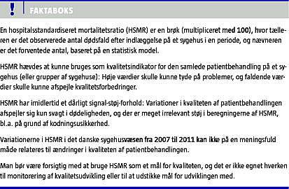 I forlængelse af erfaringerne med beregninger af HSMR i Operation Life-kampagnen i 2007-2009 [4, 5] har man publiceret kvartalsvise resultater for danske sygehuse, se [6].