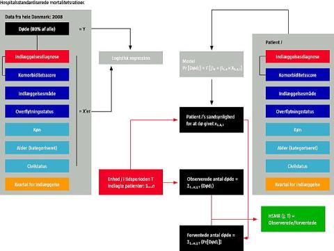 De estimerede antal dødsfald beregnes som summen af de indlagte patienters sandsynligheder for at dø. I den danske model estimeres sandsynlighederne ved hjælp af en logistisk regressionsmodel baseret på data fra 2008, dvs. de observerede dødsfald i dette år kombineret med en række prædiktive variable: indlæggelsesdiagnosen, patientens køn, alder og civilstand, tidligere og nuværende andre sygdomme (udtrykt i en såkaldt komorbiditetscore, baseret på historiske data fra Landspatientregisteret), indlæggelsesmåden (akut eller planlagt), overflytningsstatus og kvartal [14].