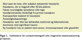 Prævalensen af hovedpine i den danske befolkning er på mere end 90%. Spørg til årsagen til patientens henvendelse. Mange er bange for at have en hjernetumor. Størstedelen af de patienter, som går til læge, har en af de primære hovedpinediagnoser: migræne, spændingshovedpine, medicinoverforbrugshovedpine eller Hortons hovedpine.