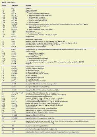fikation (ICHD-II) udgivet [7]. Denne vigtige revision af den internationale sygdomsklassifikation fortjener en kommentar, da den trods sit omfang med fordel kan anvendes i det daglige, kliniske arbejde med patienterne. En dansk, forkortet udgave, oversat af bestyrelsen for Dansk Hovedpine Selskab, foreligger nu i lommeformatudgave og på Dansk Hovedpine Selskabs hjemmeside [8]. Det er denne danske udgave, der kort vil blive præsenteret her.