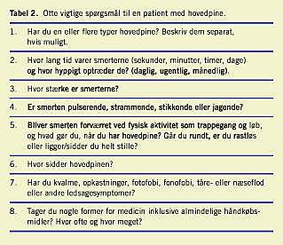 Det er naturligvis vigtigt, at man ved alle patienter, der klager over hovedpine, overvejer muligheden af en eventuel sekundær hovedpine, altså et symptom på en tilgrundliggende evt. alvorlig livstruende sygdom (Tabel 1) som tumor cerebri, subaraknoidal blødning, apoplexia cerebri eller meningitis. Ligeledes bør sekundær hovedpine altid overvejes hos tidligere hovedpineraske personer over 40 år, ved nyopstået svær hovedpine, ændret karakter af hovedpinen, ved feber, ved tilstedeværelse af andre neurologiske symptomer eller hvis hovedpinen er svær at klassificere.