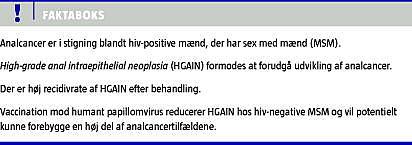Prævalensen og incidensen af high-grade anal intraepithelial neoplasia (HGAIN) har i de senere år været stigende, især hos mænd, der har sex med mænd (MSM). HGAIN er højincident hos MSM, der har hiv-infektion. Anal intraepitelial neoplasi (AIN) grad II og grad III formodes at forudgå udviklingen af analcancer, ligesom cervikal intraepitelial neoplasi (CIN)-II og -III betragtes som forstadier til cervixcancer. En ny undersøgelse har vist, at vaccination med den kvadrivalente humant papillomvirus (HPV) (qHPV)-vaccine er påvist at kunne reducere antallet af AIN blandt hiv-negative MSM, herunder MSM med HGAIN.