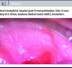 I screeningsstudier og på anal dysplasiklinikker (enkelte steder i USA og Europa) anvender man jf. ovenstående Papanicolaou (PAP)-smear til cytologisk undersøgelse, undersøgelse for anal HPV-infektion og high resolution anoscopy (HRA), der er analog til cervikal kolposkopi. Ved applikation af 3-5% eddikesyre vil områder, der er suspekte for HGAIN ved HRA, fremstå hvidlige, eventuelt med vaskulære forandringer i form af såkaldte punktuationer (Figur 1 ) eller mosaicisme [10]. Ved synlige forandringer tages der biopsi til histologisk undersøgelse. De fleste HGAIN er ikke palpable og er ikke synlige uden eddikesyreapplikation, undtagen avancerede læsioner.