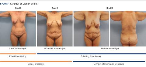 Et visuelt klassifikationssystem til gradering af MWL-forandringer er et væsentligt klinisk redskab i indikationsstilling og præoperativ planlægning af hudreducerende kirurgi. I 2019 blev Danish Scale (DS) udviklet i Danmark som et visuelt supplement til den skriftlige visitationsretningslinje. Formålet var simplificering af sværhedsgraden af de hyppigst forekommende MWL-forandringer relateret til indikationsstilling for operation. DS omfatter patienter med MWL med BMI på 21-30 kg/m2, og der er tre kategorier som cut-off points til at skelne mellem deformiteter: Grad I klassificeres som lette forandringer af kosmetisk karakter, grad II som moderate forandringer, der er tilgængelige for isolerede plastikkirurgiske indgreb, og grad III som svære forandringer, der typisk vil indicere udvidede procedurer eller kombinationsprocedurer (Figur 1). DS, som aktuelt er under validering, er implementeret med national konsensus og godkendt af Datatilsynet [9].