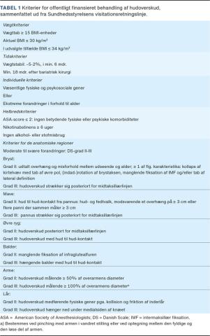 For at sikre lige adgang til offentligt finansieret plastikkirurgi efter MWL udgiver Sundhedsstyrelsen en national visitationsretningslinje indbefattende kriterierne generelt helbred, graden af vægttab, visuel præsentation samt funktion (Tabel 1). Som udgangspunkt er det patienter med moderate til svære forandringer, som udløser tilbud om behandling, såfremt der er ledsagende funktionelle og psykosociale gener. Ved ekstreme kropsdeformiteter, der er meget udtalte og afvigende set i forhold til patientens alder, køn og BMI, kan kirurgi dog tilbydes, uden at der er klager ud over kosmetiske [6, 9]. Endelig indikation hviler på en individuel helhedsvurdering og stilles ved en plastikkirurgisk speciallæge på en offentlig hospitalsafdeling.