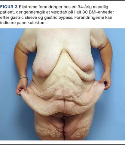 Patienter, der ikke har kunnet tabe sig til en BMI under 30 kg/m2, og som er svært generet af en tung pannus, kan på funktionel indikation behandles med excision uden underminering benævnt pannikulektomi (Figur 3). Det kosmetiske resultat er oftest utilfredsstillende, men indgrebet kan have en positiv indvirkning på patientens helbred [21].