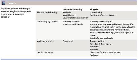 Vi har tilstræbt at komponere en klinisk retningslinje for behandling baseret på aktuel litteratur på området (Tabel 1). Baggrundslitteratur er rekvireret ved søgninger i MEDLINE ved brug af MeSH-termerne viperidae, European adder og snake bite. Vi har suppleret litteraturen ved at granske referencelister i relevante artikler samt benyttet vores egne erfaringer fra en dansk akutmodtagelse med ca. 10-15 hugormebid pr. år.