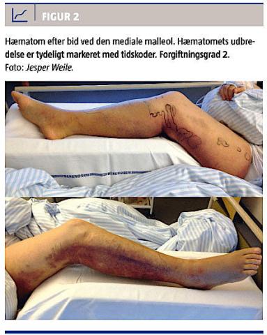 Ved det ofte smertefulde bidsted ses to punktformede tandmærker. Omkring bidstedet ses evt. lokalt ødem, rødme eller hæmatom (Figur 2). I svære tilfælde forekommer der systemiske symptomer. De mest almindelige er kvalme, opkastninger og svimmelhed. Symptomerne kan variere i sværhedsgrad, og ængstelse kan forårsage hyperventilation eller vasovagalt shock efter bid.