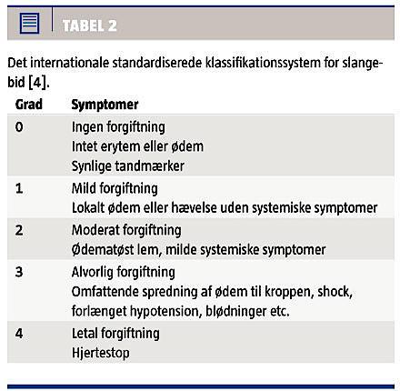 Ved ankomsten til sygehuset bør enhver patient, som er blevet bidt af en hugorm, graderes efter det internationale standardiserede klassifikationssystem for slangebid (Tabel 2) [1, 4]. Den videre behandling bør bero ikke kun på den umiddelbare gradering, men også på progressionen af symptomer. Hvis patienten stiger fra en grad til en anden, bør dette skærpe det behandlende personales opm ærksomhed.