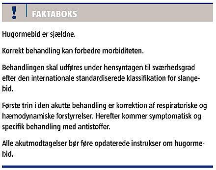 Hugormebid er en sjælden diagnose på akutmodtagelserne i Danmark, og det behandlende sundhedspersonale kan have sparsom eller måske ingen klinisk erfaring på området. Korrekt behandling kan imidlertid reducere morbiditeten, og vi anbefaler derfor kraftigt, at akutmodtagelserne løbende opdaterer instrukser på området, og at disse holdes i et simpelt format, som er letanvendeligt i en travl hverdag. Vi anbefaler akutmodtagelser, der er prædisponeret til at modtage disse patienter, at afholde undervisning i håndteringen af hugormebid hvert forår inden sæsonens begyndelse.