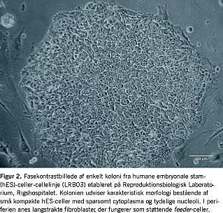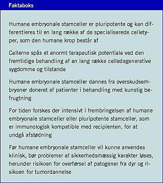 Det er i år ti år siden, at de første humane embryonale stam- (hES)-cellelinjer blev beskrevet [1]. Siden da er der udviklet vellykkede differentieringsregimener af hES-celler in vitro, og det har ledt til så forskellige specialiserede celletyper som neuroner, kardiomyocytter, pankreatiske β-celler, osteoblaster og hepatocytter [2-5]. hES-celler er derfor blevet spået et enormt terapeutisk potentiale for en lang række celledegenerative sygdomme såsom diabetes, læderet medulla spinalis, iskæmisk hjertesygdom, Parkinsons sygdom m.fl.; men nyere forskning indikerer endvidere, at også tilstande som blindhed (makulær degeneration) [6], dissemineret sklerose [7] og infertilitet (azoospermi) [8] vil kunne komme inden for terapeutisk rækkevidde. Cellebaseret sygdomsbehandling kan derfor betyde et paradigmeskifte inden for lægevidenskaben.