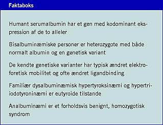 Denne artikel er baseret på egne arbejder samt på databasesøgninger i PubMed. Som søgeord er brugt dysalbuminemic hyperthyroxinemia, dysalbuminemic hypertriiodothyroninemia, proalbumin, analbuminemia elleralbuminkombineret medisoform, genetic variant, mutant, antigenic, epitope eller binding .