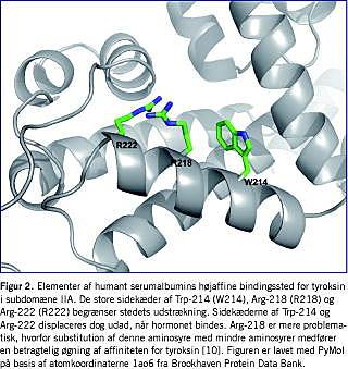 Den molekylære baggrund for den stærkere tyroksinbinding til R218H og R218P er blevet klarlagt ved røntgenkrystallografi [10]. Forklaringen er ikke, at mutationerne resulterer i dannelse af et nyt bindingssted, men at et sted, der findes i forvejen, bliver mere velegnet til at binde hormonet. Højaffin binding af tyroksin til normalt albumin foregår i en overvejende hydrofob lomme, hvor den store aminosyresidekæde til Arg-218 imidlertid forhindrer optimal binding (Figur 2 ). Ved at erstatte arginin med de mindre histidin og prolin bliver der bedre plads til liganden, og affiniteten øges; KA bliver som nævnt ca. ti gange højere. Hvis aminosyren i position 218 er endnu mindre, øges affiniteten for hormonet yderligere. Bindingsforsøg med en rekombinant mutant, hvor arginin var blevet erstattet med alanin, viste nemlig, at KA for tyroksin øges ca. 100 gange [14]. En albuminisoform med så høj affinitet for tyroksin vil formentlig have terapeutisk interesse. Isoformen vil sikkert kunne bruges ved hypertyreose såsom tyreotoksisk krise. Endvidere kunne den være velegnet ved behandling af gravide patienter, da den ikke passerer placenta.