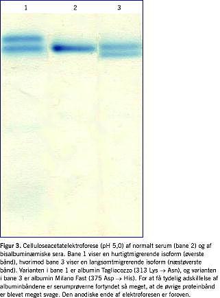 Langt de fleste genetiske varianter er fundet ved elektroforese, især ved agarosegel, celluloseacetat eller kapillærelektroforese, som er udført rent rutinemæssigt i kliniske laboratorier eller blodbanker, eller som er foretaget som led i genetiske undersøgelser. Homozygoti er karakteriseret ved at have et enkelt albuminbånd, der dog kan være displaceret. Elektroforese af heterozygote personers serum vil typisk vise to albuminbånd. Det ekstra bånd kan enten repræsentere en hurtigtmigrerende (mere negativ) eller en langsomtmigrerende (mindre negativ) isoform; bane 1 og 3 i Figur 3 . Hyppigheden af bisalbuminæmi opgives typisk til at være fra 1:1.000 til 1:3.000 [17]. I isolerede befolkningsgrupper kan hyppigheden være meget større. For eksempel er den 20% eller mere i visse amerikanske indianerstammer og 9,5% i et folkefærd kaldet kannibar i det sydlige Indien [18]. Hyppigheden afhænger dog af den metodologi, der anvendes. Anvendelse af en vertikal type gelelektroforese, udført ved flere pH-værdier, viste, at hyppigheden af bisalbuminæmi i Japan var fra 1:300 til 1:400 [18]. Endvidere viste en undersøgelse, udført med flere elektroforetiske teknikker af 38.000 bloddonorer i Tyskland, at hyppigheden af bisalbuminæmi var ca. 1:400 [18]. Når man vurderer disse hyppigheder, skal man tage højde for, at man med elektroforese kun kan afsløre de mutationer, der resulterer i ændringer i albumins nettoladning (eller i store ændringer i proteinets struktur). Endvidere udføres langt de fleste elektroforeser i denne forbindelse under native forhold. Det betyder, at det kun er mutationer på albumins overflade, der bliver detekteret. Som eksempler herpå kan nævnes, at de syndromer, der er omtalt i det foregående afsnit, har normal albuminelektroforese [2, 3, 16]. Så alt taget i betragtning er albuminisoformer nok hyppigere and almindeligt antaget.