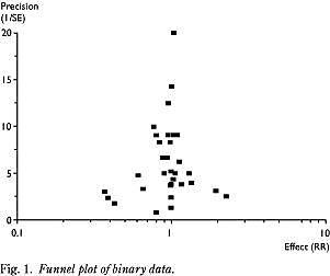 Vi foretog en række planlagte subgruppeanalyser, for at se om vore resultater var følsomme over for karakteren af placebobehandlingen, type af effektmål samt forskelle i primærforsøgenes metodologiske kvalitet. Vi afsatte også effekten i hvert forsøg mod den reciprokke standardfejl (som øges med antallet af forsøgsdeltagere). Variationen i den estimerede effekt mindskes ved øget deltagerantal, så det forventelige udseende af et sådant diagram er en symmetrisk tragt (funnel) . Markant asymmetri i sådanne funnel plots skyldes ofte, at små forsøg rapporterer større effekter end store forsøg, fx på grund af publikationsbias eller andre former for bias (15).
