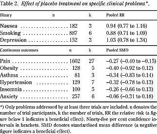 Tre eller flere uafhængige forsøg undersøgte effekten af placebobehandling på smerte, overvægt, asthma, hypertension, søvnløshed og angst. Kun forsøg af smerte viste en statistisk signifikant effekt, standardiseret gennemsnitlig differens -0,27 (-0,40 til -0,15). Effekten svarer til en reduktion af smerteintensitet på 6,5 mm på en 100 mm visuel analog skala. Sikkerhedsgrænserne for estimatet på effekten af placebobehandlinger på de øvrige kliniske tilstande var brede (Tabel 2).