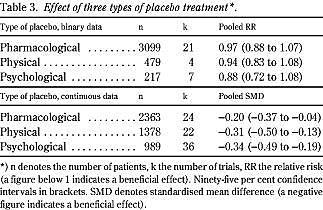 Placebobehandling havde ingen statistisk signifikant effekt på binære effektmål, samlet relativ risiko 0,95 (95% sikkerhedsinterval 0,88 til 1,02). Den samlede relative riskiko for forsøg med subjektive effektmål var 0,95 (0,86 til 1,05), og for forsøg med objektive effektmål 0,91 (Tabel 1 ) (0,80 til 1,04).