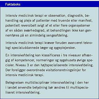 <li>Intensiv terapi-definitioner, dokumentation og visitationsprincipper. Sundhedsstyrelsen, 2006. www.sst.dk/publ/Publ2006/PLAN/Intensiv_terapi/Intensiv_terapi.pdf /okt 2006.</li>