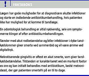 Lægen har gode muligheder for at diagnosticere disse akutte infektioner og starte en indledende antibiotikumbehandling, hvis patienten ikke har mulighed for at komme til tandlæge. Det er vigtigt at være klar over, at en odontologisk behandling altid er nødvendig, selv om symptomerne klinger af efter antibiotikumbehandlingen. Den akutte odontologiske behandling består af drænage af pus gennem tanden/tandkødslommen eller ved incision af absces. Kun hvis der er påvirket almentilstand og risiko for sænkningsabsces, bliver der hos tandlægen suppleret med antibiotika, og det er derfor bedre, at patienten bliver behandlet hos tandlægen, end at der gives unødvendig antibiotikum i forbindelse med et lægebesøg.