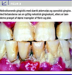 Nekrotiserende gingivitis er oftest en akut smertegivende tandkødsbetændelse, der viser sig med let genkendelige fibrinbeklædte ulcerationer, som i starten ses mellem tænderne, men senere også på den faciale gingiva (Figur 3 ). Tilstanden er karakteriseret ved en markant foetor ex ore. Tilstanden kan ubehandlet sprede sig til tandens knoglefæste. Nekrotiserende gingivitis findes i vore dage hyppigst hos hiv-seropositive patienter. Der kræves omhyggelig odontologisk behandling med rensning og renhold af gingiva. Tilstanden kan initialt behandles med antibiotikum, bedst med metronidazol, der gør patienten smertefri på en til to dage. Uden odontologisk behandling, der indebærer omhyggelig rensning og evt. kirurgisk korrektion af gingiva, vil den nekrotiserende gingivitis gå fra det akutte til et kronisk stadium med forsat destruktion af slimhinde og knogle omkring tænderne til følge.