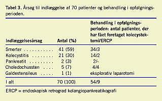 I opfølgningsperioden blev 70 patienter indlagt. Af disse patienter blev 55 opereret, hvilket svarer til 25% af den samlede gruppe (95% sikkerhedsgrænse: 19-31%), og hos 29 personer svarende til 13% af den samlede gruppe (95% sikkerhedsgrænse: 9-18%),udvikledes der komplikation i forbindelse med galdestenssygdom (Tabel 3 ).