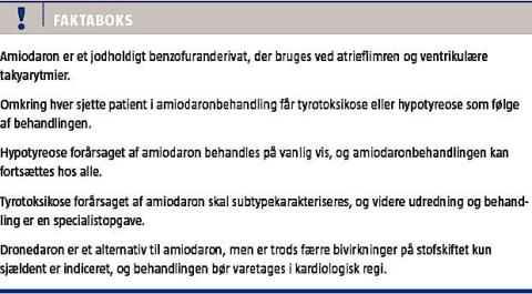 Behandling med amiodaron har opnået stor udbredelse på grund af stoffets unikke antiarytmiske egenskaber. Dets effektivitet afspejles af et lavere number needed to treat på tre vs. 4-10 for andre antiarytmika til profylakse mod recidiverende atrieflimren [1]. En væsentlig bivirkning ved amiodaronbehandlingen er udvikling af stofskiftesygdom.