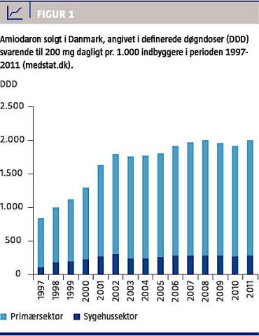 Amiodaron har i Danmark været benyttet i stor stil i de seneste 10-15 år. Figur 1 viser forbruget (DDD, definerede døgndoser) af amiodaron i såvel den primære som den sekundære sektor i perioden 1997-2011. Behandlingen påbegyndes ofte i sygehusregi og fortsættes i måneder til år, efter at patienterne er udskrevet. Derfor udskrives recepter oftest i primærsektoren med betydelige regionale forskelle. Således har forbruget omkring 2000 været mere end dobbelt så stort i Aalborg som i København [9]. Forbruget har, som det fremgår af Figur 1, været konstant i de seneste ti år, og bedømt ud fra dronedarons moderate effektivitet og mortalitetsprofil, vil amiodaron fortsat have en fremtidig plads i behandling og forebyggelse af arytmier. Det er derfor vigtigt med løbende opdatering af og samarbejde mellem kardiologer og endokrinologer for identificering og behandling af amiodaroninduceret thyroideasygdom.
