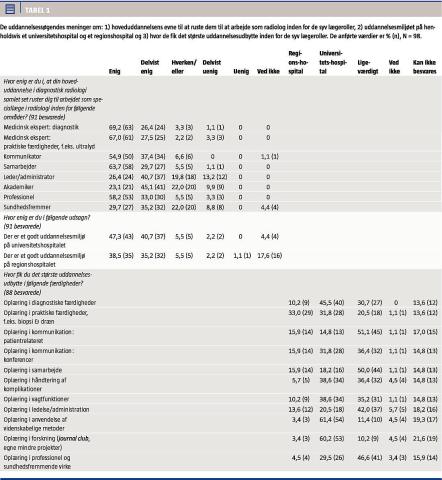 Af Tabel 1 fremgår det, om de uddannelsessøgende følte, at hoveduddannelsen samlet set rustede dem til at arbejde som radiolog inden for de syv lægeroller, hvad de syntes om uddannelsesmiljøet på henholdsvis et universitetshospital og et regionshospital, samt hvor de syntes, at de fik det største uddannel-sesudbytte inden for de syv lægeroller. I Tabel 2 angives, hvordan det optimale uddannelsesforløb efter de uddannelsessøgendes mening ville se ud set i relation til at opnå de målbeskrevne kompetencekrav.