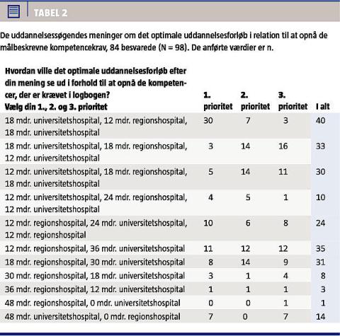 I Tabel 2 angives vurderingen af det optimale uddannelsesforløbs sammensætning. De fleste (30 af 84) havde 18 mdr. på et universitetshospital, 12 mdr. på et regionshospital og 18 mdr. på et universitets-hospital som deres førsteprioritet; 62 af 84 havde 12 mdr. på et regionshospitalsophold og 36 mdrs. universitetsophold som første- eller andenprioritet.