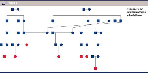 Ved familiær multipel sklerose (MS) forekommer der et øget antal MS-tilfælde i en familie i forhold til forventet. Der findes ingen præcis definition af familiær MS, men i de fleste studier inkluderer man familiemedlemmer op til tredje led fra probanden. Op til 20% af alle MS-tilfælde er familiære [1]. Dette er yderst relevant i den kliniske dagligdag, da patienter med MS og deres familiemedlemmer ofte er bekymrede for, om der hos flere i familien udvikles MS. Den genetiske baggrund for den øgede tilbøjelighed for at udvikle MS er kompleks (Figur 1) og følger ikke en mendelsk arvegang, hvilket tydeligt ses på stamtræet (Figur 2). I tvillingestudier har man påvist en konkordansrate for monozygote tvillinger (MZ) på mindre en 100%, men samtidig en væsentlig højere konkordansrate for MZ- end for dizygote (DZ)-par, hvilket tyder på, at genetik spiller en rolle, men at MS er multifaktoriel.