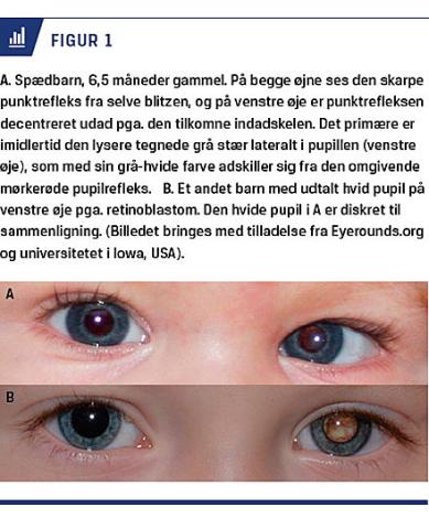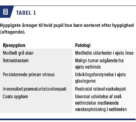 De hyppigste årsager til hvid pupil hos børn op til børnehavealderen er medfødt grå stær og retinoblastom (Tabel 1) [1]. Det drejer sig om sjældne øjensygdomme; således diagnosticeres der i Danmark årligt ca. 15 nye tilfælde af medfødt grå stær hos børn under et år og fem nye tilfælde af retinoblastom hos små børn. Sygdommene er vigtige at kende, fordi de kan have alvorlige konsekvenser. Ved medfødt grå stær trues den normale synsudvikling, fordi den uklare linse hindrer den billeddannelse på øjets nethinde, der er nødvendig for udviklingen af et normalt syn. Hvis tilstanden ikke behandles, bliver øjet »dovent« (amblyopt) og kan