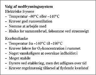 Ved anvendelse af elektriske frysere skal de placeres i et lokale med passende ventilation, idet høje temperaturer og begrænset ventilation kan nedsætte frysernes levetid væsentligt. Der bør kun anvendes kummefrysere, da temperaturen i skabsfrysere hurtigt stiger ved åbning. Også de elektriske frysere bør naturligvis være tilkoblet et alarmsystem, optimalt med døgnovervågning, og der bør fastlægges procedurer ved strømnedbrud.