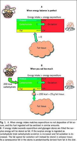 Indtager og absorberer man mere energi, end man forbrænder, deponeres der fedt i depoterne, uanset om overspisningen kommer fra excessive mængder kulhydrat, protein, fedt eller alkohol. Under normale omstændigheder skyldes det ikke, at kulhydrat, protein og alkohol omdannes til fedt (de novo-lipogenese), men at de tre makronæringsstoffer stimulerer deres egen oxidation og supprimerer fedtoxidationen (Fig. 1A ). Indtager man f.eks. en ekstra portion kulhydrat, således at man kommer i positiv energibalance, vil kulhydratoxidationen øges tilsvarende. Omvendt vil fedtoxidationen reduceres tilsvarende, og det sparede fedt fra kosten vil deponeres i depoterne (Fig. 1B). At der ikke eksister nogen kvantitativ relevant omdannelse af kulhydrat til fedt er imidlertid blevet misforstået som, at man ikke kan blive fed af kulhydrat og protein. Men bringes man i en positiv energibalance, vil man tage på, fordi fedtforbrændingen hæmmes, således at kostens fedt i stedet for at blive forbrændt bliver deponeret i fedtdepoterne. I hvilket omfang det er muligt at omdanne kulhydrat til fedt, og hvad der kræves, for at denne proces bliver kvantitativt betydende hos mennesker, har stor teoretisk interesse, men er uden betydning for kostråd og sundhedsoplysning. Med andre ord er det en positiv energibalance, man skal undgå, og det klares bedst ved at spise en kost som mætter godt, skære på portionsstørrelsen og være fysisk aktiv.