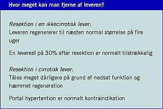 Ved cirrose er regenerationen hæmmet, og resektioner tåles dårligere. Den volumetriske bestemmelse er af mindre betydning, fordi leverresten efter operation ikke kan forventes at have normal funktion. Operativ risiko hos leverpatienter kan normalt bedømmes med Child-Pugh-score, der bygger på albumin, koagulationsfaktorer, bilirubinniveau, ascites og encefalopati. Ved inkompenseret leversygdom (Child Pugh-gruppe B og C) tåles resektioner dårligt, mens patienter med kompenseret cirrose (Child-Pugh-gruppe A) kan tåle mindre resektioner [2, 10]. I et spansk arbejde har man påvist, at den venøse trykgradient over leveren (hepatic venous pressure gradient ) er en god prognostisk markør, således at man bør afholde sig fra at operere patienter med portal hypertension og gradient over 10 mmHg [10]. I Japan, hvor der er stor erfaring med resektion af hepatocellulære karcinomer hos patienter med cirrose efter hepatitis B og C, anvender man måling af indocyaningrøntretention efter 15 minutter som funktionstest. Indocyaningrønt fordeler sig alene i plasma, hvorfra det optages via raske leverceller og elimineres til galden. Hos raske personer er kun 3,5-10% tilbage i plasma 15 minutter efter injektion af bolus. Ved værdier op til 14% tåles resektion af op til halvdelen af leveren, ved 14-20% kan man overveje resektion ved at udvide massen af leverceller med portal embolisering, og hvis 15-minutters-retentionen er > 20%, anses resektion for at være uigennemførlig [5, 9]. Kun på få vestlige institutioner anvender man indocyaningrøntretentionstesten, men i en nyligt publiceret oversigt foreslås den anvendt i særlige situationer [9]. I realiteten er der i Danmark meget få patienter med cirrose, der kan tilbydes resektion.