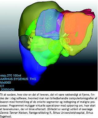 Ved for stor leverresektion er der risiko for postoperativt leversvigt. Dette opstår inden for 3-5 dage efter kirurgi og viser sig ved gulsot, koagulopati, encefalopati og eventuelt ascites samt nyre- og lungesvigt. Der er det såkaldte small for size syndrome , som har høj mortalitet. Spørgsmålet om, hvor lidt lever man kan nøjes med, er blevet belyst i konsekutive serier [4-6] med patienter, der fik foretaget partiel leverresektion på grund af primære eller sekundære levertumorer. CT-baseret volumenbestemmelse før og efter resektion tydede på, at risikoen for postoperativt leversvigt øges betydeligt, hvis mere end 70-75% af leveren fjernes hos yngre voksne (< 40 år) [7, 6]. Ved resektion af levercancer er grundsygdommen så farlig, at en mortalitet på op til 5% af nogle anses for at være acceptabel, men i de bedste serier er den betydelig lavere [5]. Afhængigt af hvor stor en mortalitet, der accepteres, anbefaler forskellige forfattere, at mindst 30% [4, 8, 9], 35% [6] eller 40% [9] af den fysiologiske levermasse resterer efter en operation, men nogle steder arbejder man i dag med en grænse helt ned til 25% [2]. Den fysiologiske levermasse estimeres da som 2,5% af legemsvægten. Kravet er højere hos ældre, som tåler resektion dårligere [9]. Selv på centre, hvor man er rutinerede og har lav mortalitet, stiger længden af det postoperative ophold på intensivafdelingen, når den resterende lever kommer ned omkring 30%, i modsætning til, når den er på 40% og 50% [8].